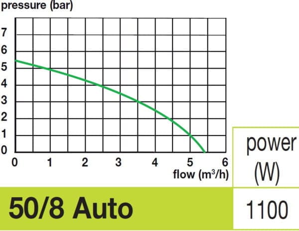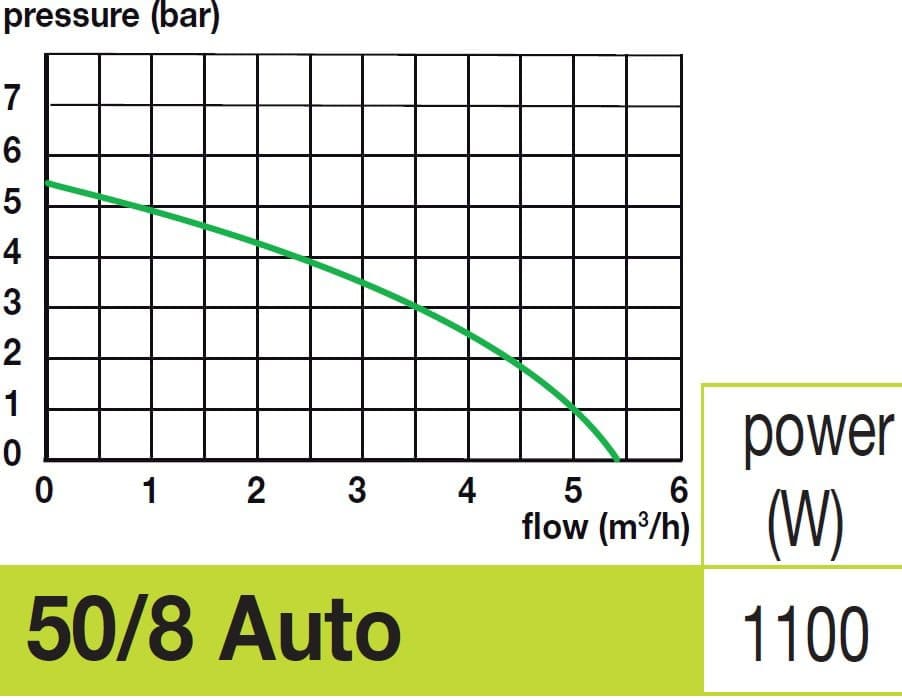 Spido Pro 50/8 помпата е ефективна, благодарение на 8 турбини! Нейната мощност е 1100 W, а максималното налягане може да достигне до 5,7 бара. Тялото на помпата от неръждаема стомана която осигурява дълъг живот и висока надеждност. Помпата има вграден електронен пресостат, той предпазва помпата от работа на сухо.