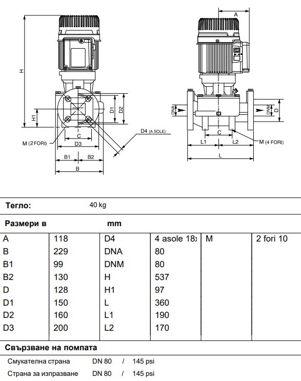 - Фланци (стандартни): DN 40, DN 50, DN 65, DN 80 (4 отвора)