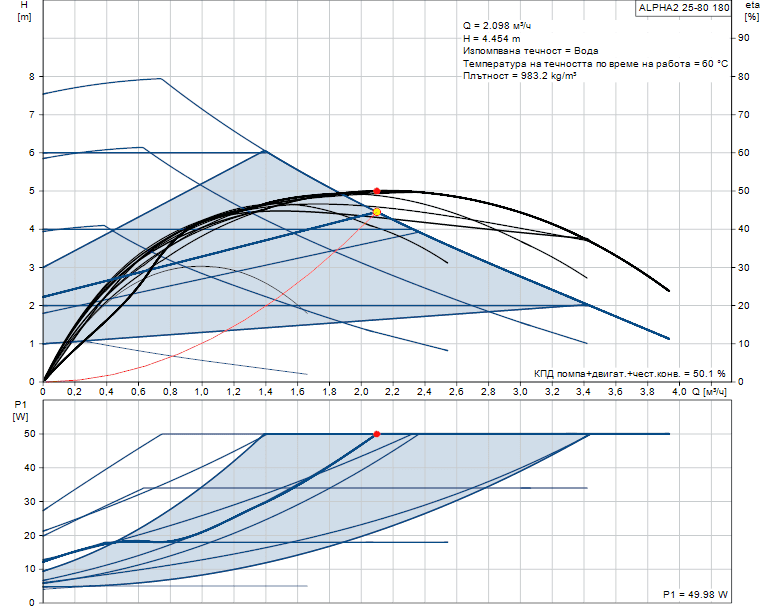- Максимален напор: 80 dm (≈ 8,0 m)