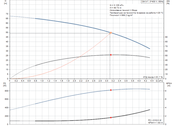 Grundfos CM 3-7 3 x 220V – вертикална многостъпална помпа с 3.1 м³/ч дебит и 48.88 m напор. Мощност 1.1 kW, неръждаем хидравличен блок, чугунен корпус, идеална за компактни системи с високо налягане.