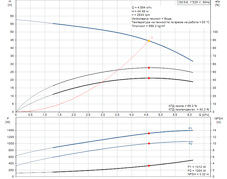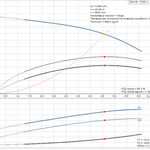 Grundfos CM 5-6 – 1-фазна многостепенна центробежна помпа с мощност 1.3 kW, напор 46.5 m и дебит 4.7 м³/ч.