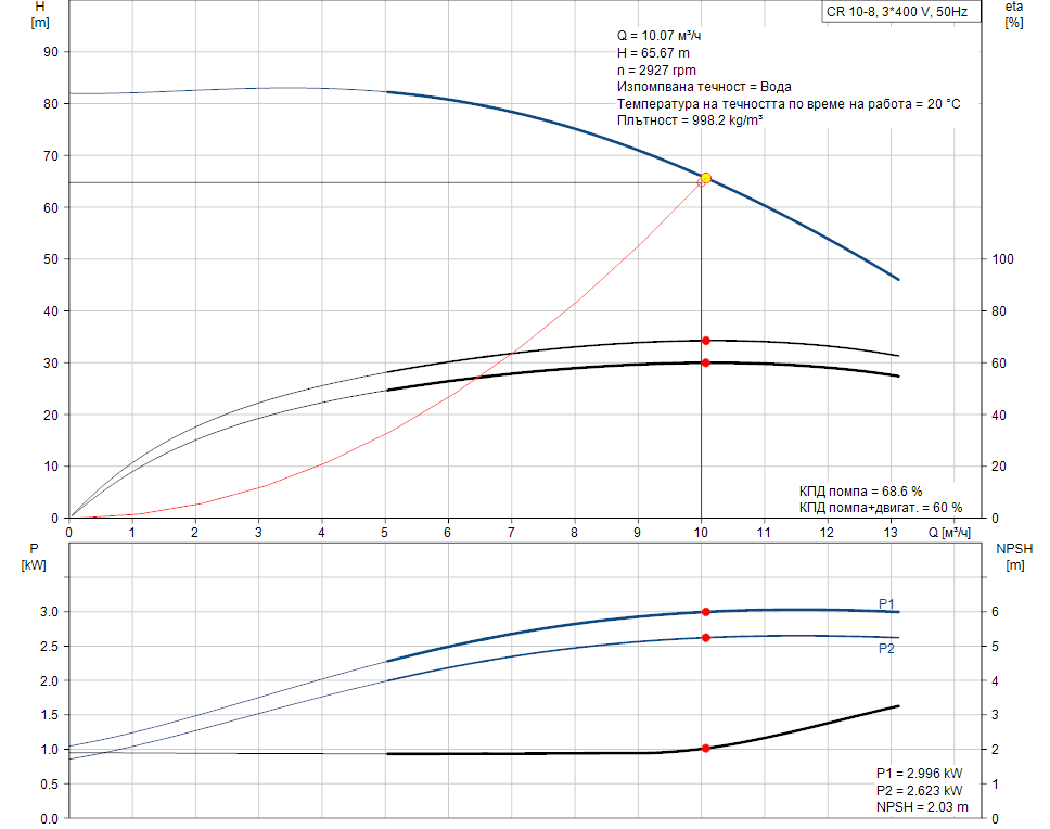Grundfos CR 10-08 – вертикална многостъпална помпа с дебит 10.07 м³/ч и напор 65.67 m