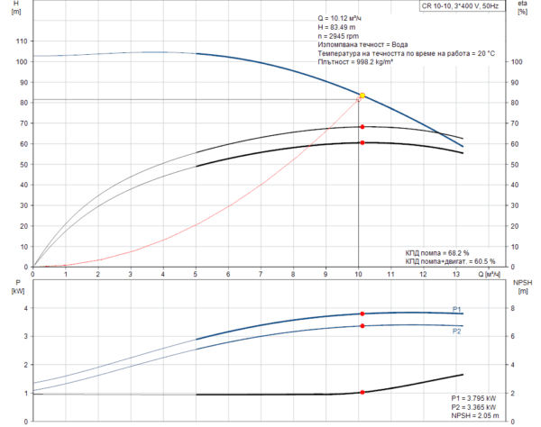 Grundfos CR 10-10 – вертикална многостъпална помпа с дебит 10.12 м³/ч и напор 83.49 m