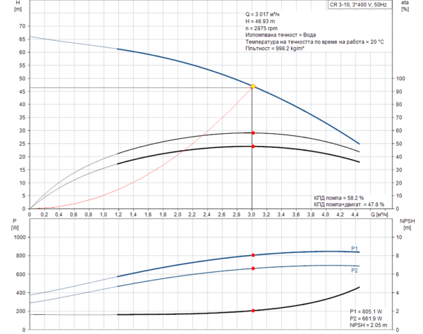 Grundfos CR 3-10 – вертикална многостъпална помпа с дебит 3.017 м³/ч и напор 46.93 m