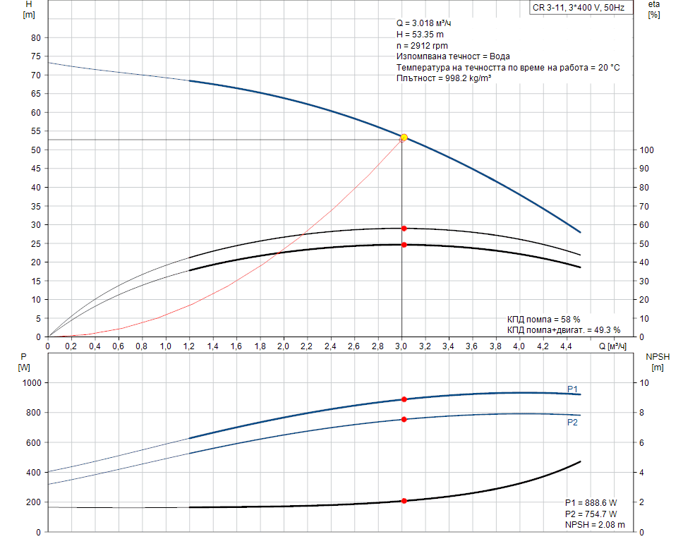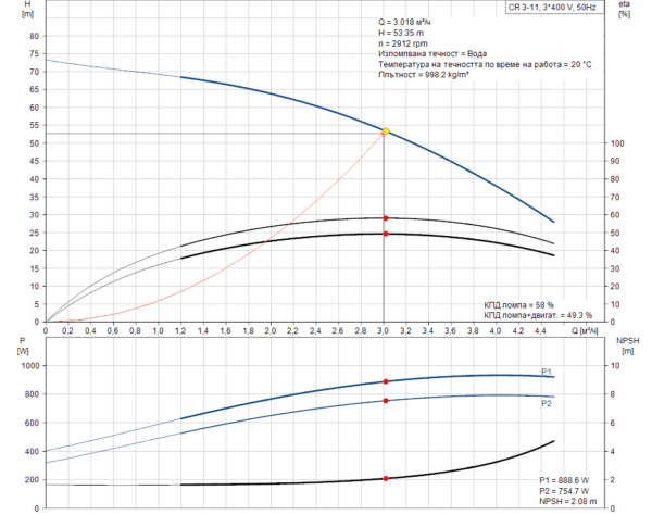 Grundfos CR 3-11 – вертикална многостъпална помпа с дебит 3.018 м³/ч и напор 53.35 m