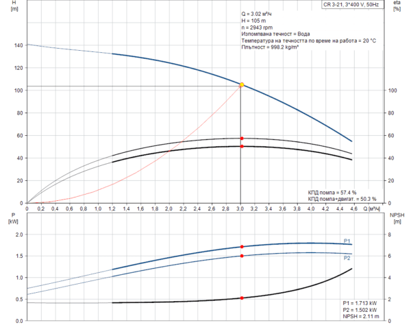 Grundfos CR 3-21 – вертикална многостъпална помпа с дебит 3.02 м³/ч и напор 105 m