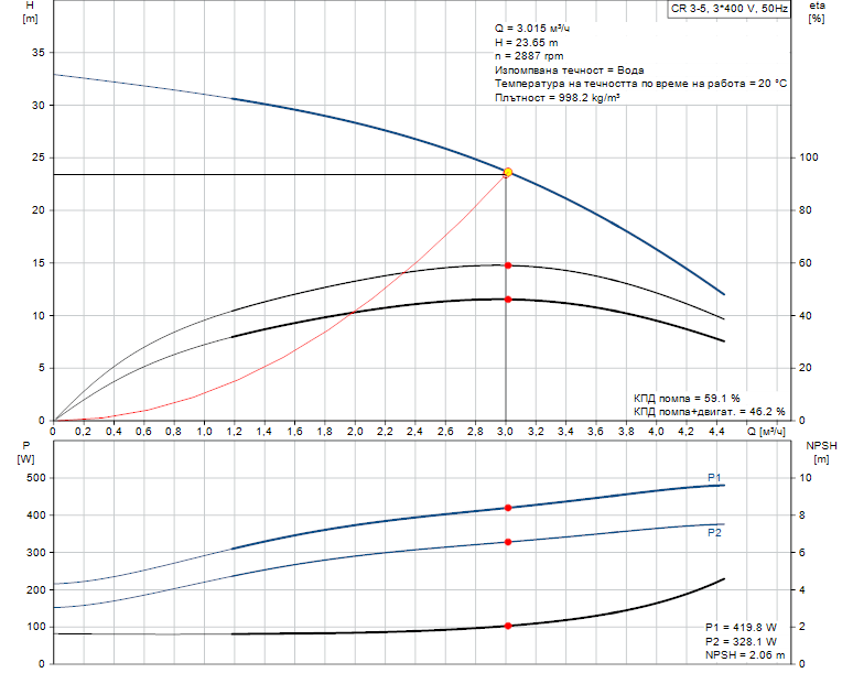 Grundfos CR 3-5 – вертикална многостъпална помпа с дебит 3.015 м³/ч и напор 23.65 m