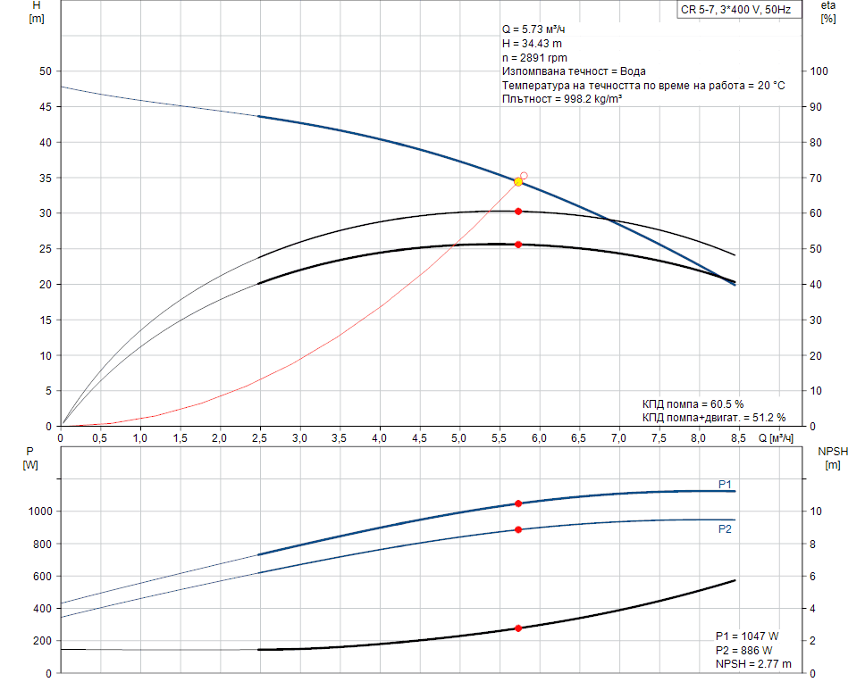 Мощност (Р2), изисквана от помпата: 1.1 kW