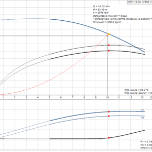 Вертикална, многостъпална центробежна помпа с входен и изходен отвори на едно и също ниво (проточна). Материалите на