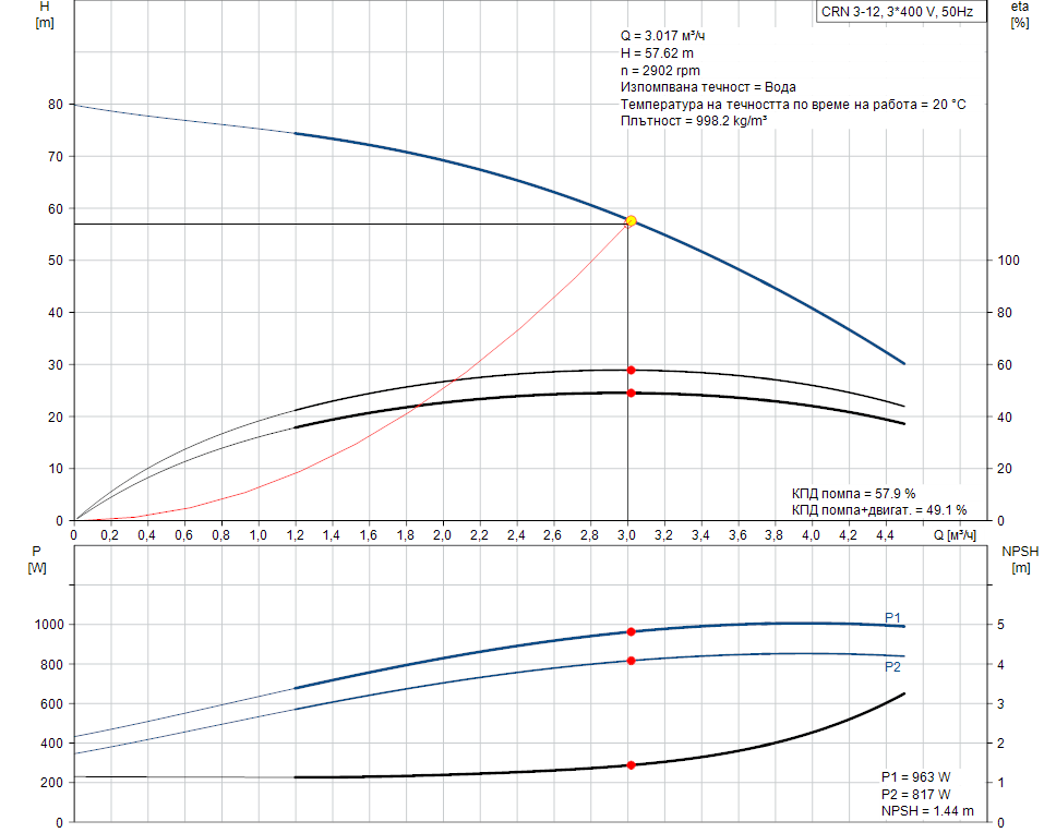 Резултатен напор на помпата: 57.62 m