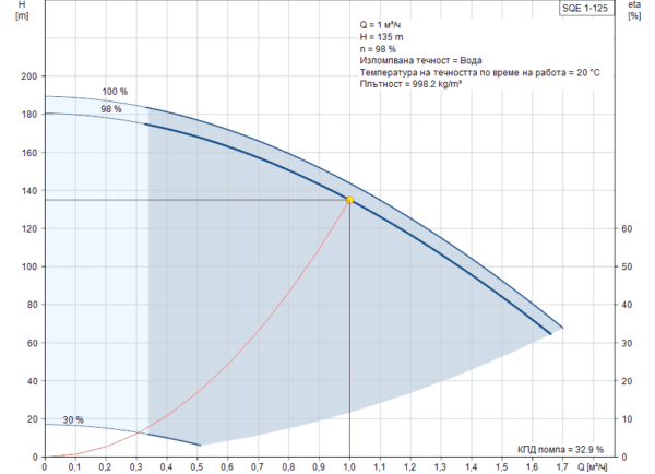 Описание: Grundfos SQE 1-125 е 3 цолова многостъпална сондажна помпа, предназначена за битово водоснабдяване, пренос на течности до резервоари и напояване и други приложения. Тази помпа е оборудвана с “плуващи” работни колела, всяко с отделен лагер от волфрамов карбид/керамика. Основни функции включват плавен старт и защити от работа на сухо, пренапрежение, поднапрежение, претоварване и прегряване. В случай на претоварване, помпата се изключва за 5 минути и след това прави опит за повторен старт. Ако помпата се рестартира и сондажът е празен, тя ще спре след 30 секунди.Монофазният двигател с ротор с постоянен магнит осигурява оптимална ефективност при широки граници на товара. Двигателят е снабден със сваляем капак с куплунг.