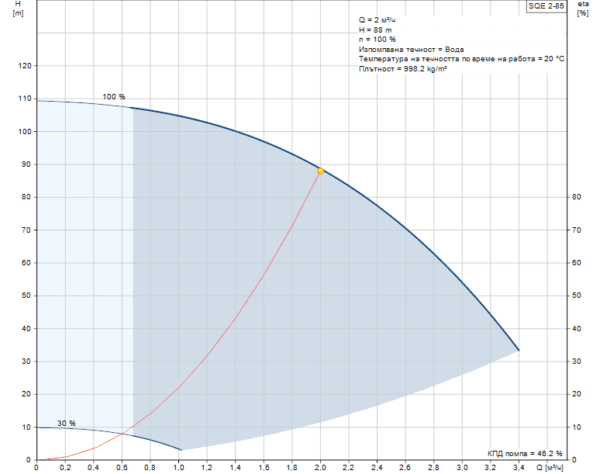 Grundfos SQE 2-85 е 3 цолова многостъпална сондажна помпа, предназначена за битово водоснабдяване, пренос на течности до резервоари и напояване и други приложения. Тази помпа е оборудвана с “плуващи” работни колела, всяко с отделен лагер от волфрамов карбид/керамика. Основни функции включват плавен старт и защити от работа на сухо, пренапрежение, поднапрежение, претоварване и прегряване. В случай на претоварване, помпата се изключва за 5 минути и след това прави опит за повторен старт. Ако помпата се рестартира и сондажът е празен, тя ще спре след 30 секунди.Монофазният двигател с ротор с постоянен магнит осигурява оптимална ефективност при широки граници на товара. Двигателят е снабден със сваляем капак с куплунг.