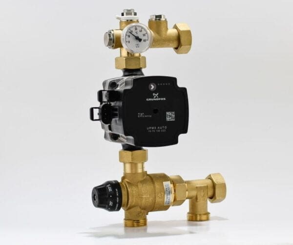 Смесителна група за за подово нискотемпературно отопление с помпа Grundfos UPM3 Auto 15-70 130, присъединяване с гайка 1″, обхват на настройка 35÷60°C AS-FIX F5