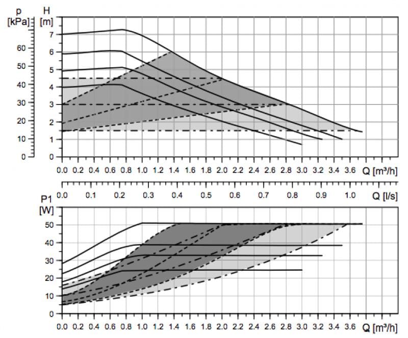 - Мощности и максимални налягания (напори) на помпата при съответните режими: крива IV: максимален напор 7 m, консумация max. 52 W; крива III: максимален напор 6 m, консумация max. 39 W; крива II: максимален напор 6 m, консумация max. 33 W; крива I: максимален напор 4 m, консумация max. 25 W