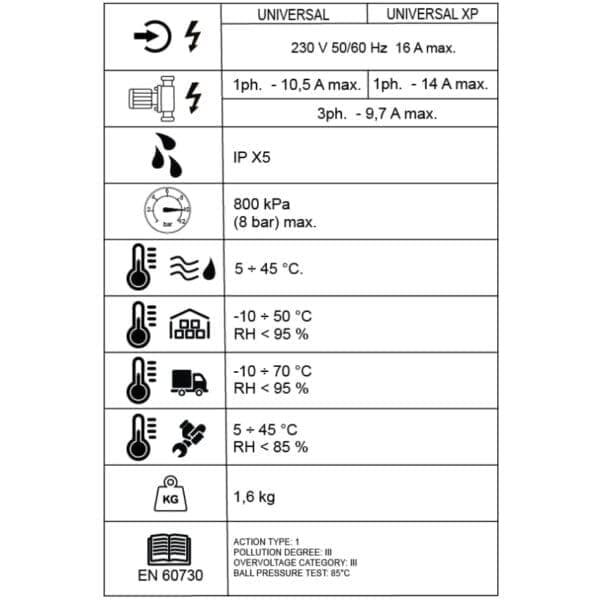 • Захранване: монофазно 230 V AC ±10%, 50/60 Hz