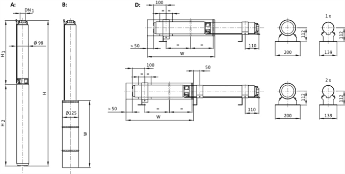 Многостъпална потопяема помпа с възможност за работа под пълен залив с радиални или полу-аксиални работни колела в изпълнение с кожух за вертикален или хоризонтално монтаж, с вграден възвратен клапан. Устойчив на корозия моно- или трифазен мотор за директно свързване с маслен пълнеж, оборудван с пясъчна защита и механично уплътнение, както и самосмазващи се лагери. Моторът се охлажда посредством работния флуид. Затова агрегатът трябва да работи винаги в потопено състояние. За хоризонталния монтаж е необходим охлаждащ мантел. За изпомпване на вода от сондажи с максимална дълбочина на потапяне 200 m и максимално съдържание на пясък 50 g/m³.
