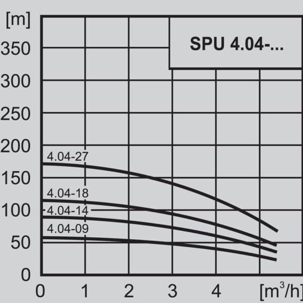 WILO SPU 4.04-18-B/XI4-50-3-400 е СОНДАЖНА помпа от материали устойчиви на корозия. Мотора на помпата за вода е изработен от inox и се охлажда, изключително устойчив на колебания в напрежението. Сондажната помпа се използва при напояване, битово водоснабдяване и изпомпване. Напояването с този модел може да се извършва от сондажи или резервоари и кладенци. Особеното тук е, че при монтиране на дълбочинната помпа от кладенец или резервоар се изисква оборудване с мантел. Потопяемата помпа има вграден възвратен клапан, NEMA-куплунг и един метър кабел. Подходяща за води с високо съдържание на пясък до 50 g/m3.