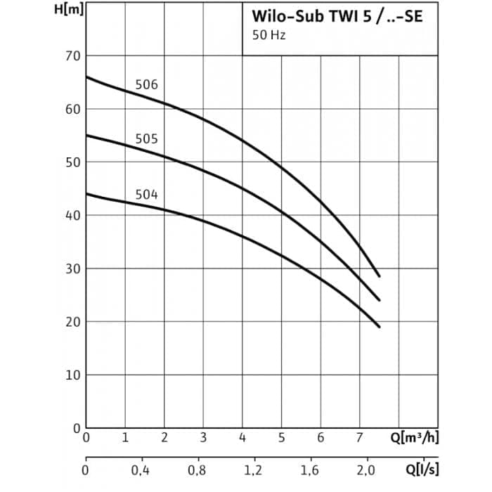 WILO Sub TWI 5 505 EM е 5″ потопяема сондажна помпа, подходяща за изпомпване на чиста вода от сондажи с минимален диаметър 177 mm, кладенци, цистерни и резервоари. Използва се за битово водоснабдяване и напояване. Подходяща е за води без абразивни или дълговлакнести примеси. Помпата е изработена от висококачествена неръждаема стомана, устойчива на корозия, с вграден възвратен клапан и самоохлаждащ се монофазен мотор.