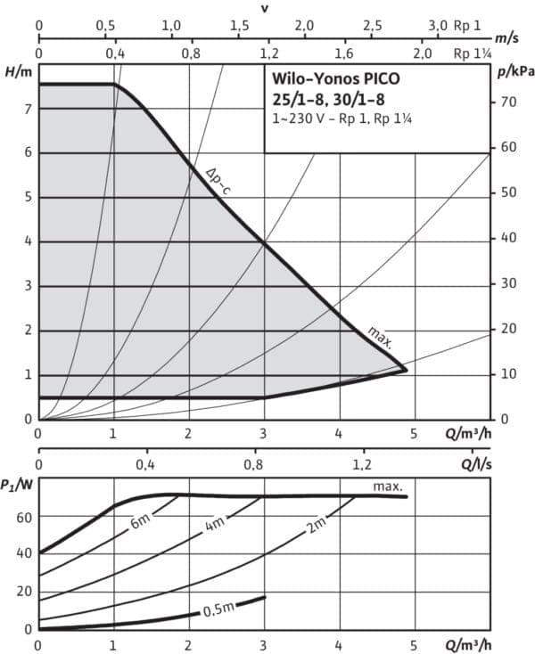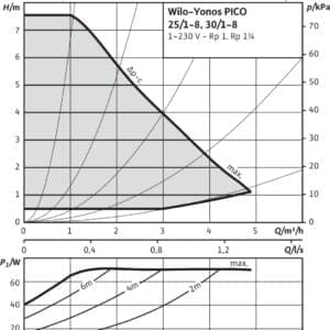 Wilo Yonos PICO1.0 25-1-8 – енергийноефективна циркулационна помпа с EC мотор и електронно управление, подходяща за отопление и подово отопление. Работни характеристики: дебит до ~4 m³/h, напор до 8 m.